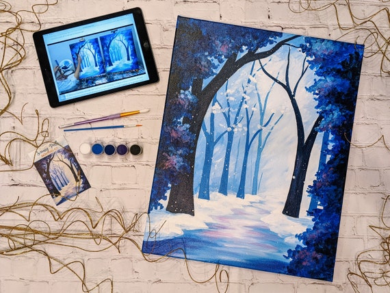 Snowy Path Canvas Painting Kit Video Tutorial Free Palettes Aprons With Orders Of 10 Painting Party Kit Diy Paint Kit Etsy
